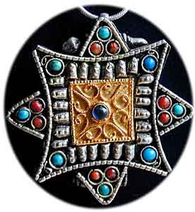 Amulettbehälter in Form von Mandalas sind weit verbreitet. Die unten gezeigten Behälter sind aus Weißmetall, mit eingesetzten Türkisen und Koralle, und lassen sich durch Abziehen des Deckels auf der Rückseite öffnen