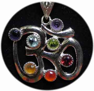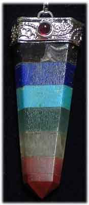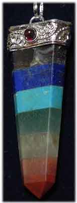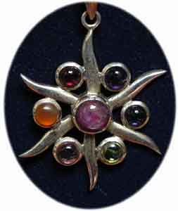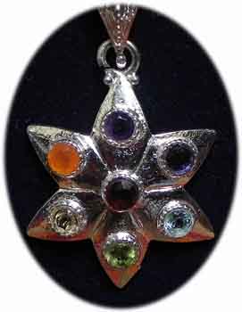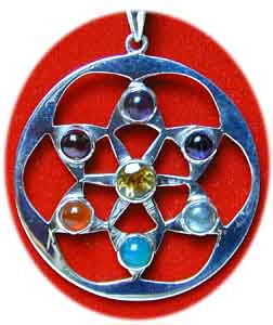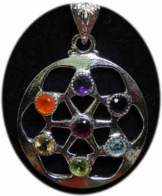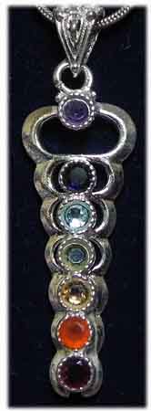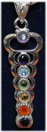 Chakra Amulette vitalisieren die sieben Energiezentren oder Chakras des Körpers - symbolisiert durch sieben Edelsteine. |