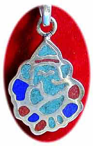 Symbolkette Ganesh Perlen/Türkiskette mit InlaySilberanhänger, Lapislazuli/Türkis/Koralle auf Sterling Silber symbolisiert den Glücksbringer Ganesh. Ø Ganesh Anhänger: 3 x 2,5 cm Gewicht: 26 g Kettenlänge: 42 cm 96,- € Bestell-Nr. 504038