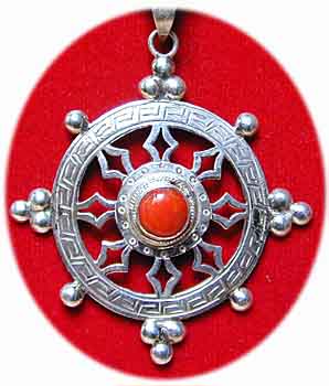 Tibetisches Glückssymbol Lotus Symbol der Erleuchtung Türkis/Lapislazuli/Perlmutt Inlay auf massiver Silberplatte Gewicht 14 g Ø: 3 cm € 74,- Bestell-Nr. 503689