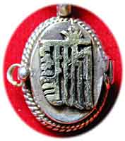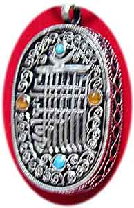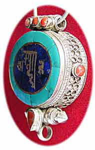 Kalachakra Gau mit Türkisen/Lapislazuli/ Koralle auf Sterling Silber mit schöner Einlegearbeit Der rückseitige Deckel läßt sich öffnen Gesamtgewicht 36g Ø: 4 cm Dicke: 1,5 cm € 180,- Bestell-Nr. 5-112945