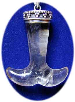 Kartika Amulett Bergkristall symbolisches Attribut (als Waffe) der Dakinis und Mahakala Schutzsymbol Gewicht 11 g Ø: 2,5 cm In Sterling Silber gefaßt € 26,- Bestell-Nr. 503844