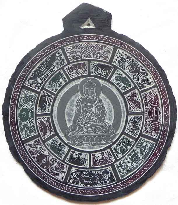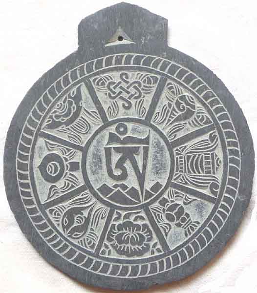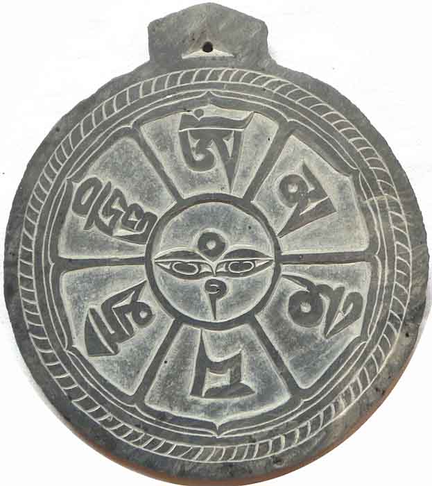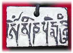 Mantrasteine mit dem Mantra Om Mani Padme Hum, in Stein geschnitzt |