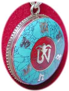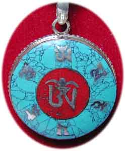 OM Amulett Anhänger mit eingelegtem OM in Silber auf Malachit/Koralle/Lapisla zuli/ und Sterling Silber Gewicht 7 g Ø Anhänger: 2,5 cm € 28,- Bestell-Nr. 502105