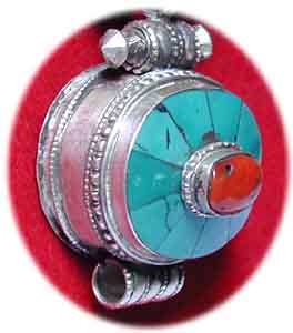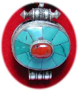 Türkis Amulettkette Das Amulett läßt sich auf der Rückseite öffnen Kettenglieder: Sterling Silber, Türkise, Koralle Gewicht 57 g Ø Amulett: 2,5 cm mit eingelegtem Türkis Kettenlänge: 45 cm € 232,- Bestell-Nr. 506121