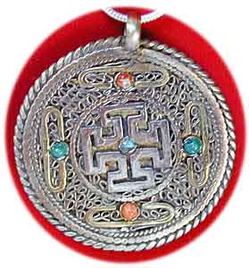 Schutzamulette aus Metall mit den tibetischen Glückszeichen, dem Mantra Om Mani Padme Hum und dem Schutzsymbol Unendlichker Knoten