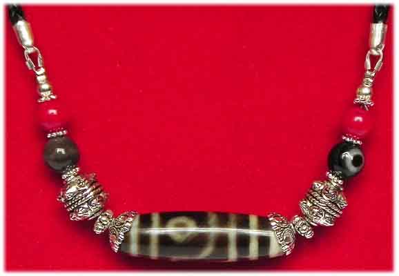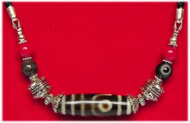 Dzi Stein Kette am Lederband mit Silber,- Sheepseye,- und Korallen Perlen Ø Dzi Stein 4 x 1,4 cm Länge: 69 cm € 98,- Bestell-Nr. 503685