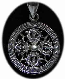 Vajra Mandala Anhänger Sterling Silber sehr schön filigran und räumlich gearbeitet auf einer Seite das Doppelvajra, auf der anderen Seite ein Vajra-Mandala Gewicht 4 g Ø: 2 cm € 36,- Bestell-Nr. 504191x