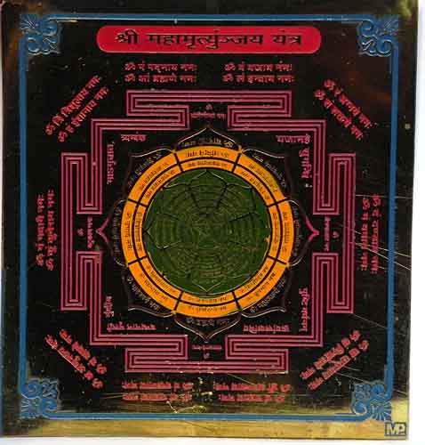 Shri Maha Mruntunjay Yantra Dieses Yantra ist bekannt als mächtiges, tantrisches Yantra von Shiva. Es oll Krankheiten vorbeugen, vorzeitigen Tod durch Unfall oder Krankheit verhindern sowie die Gesundheit der ganzen Familie schützen. Es wird auch benutzt bei Anspannung, Stress und allgemeinen Sorgen. Mantra:"Om namah shivay" Kupfer, Größe: 4,5 x 4,5 cm € 4,- Bestell-Nr. 503761